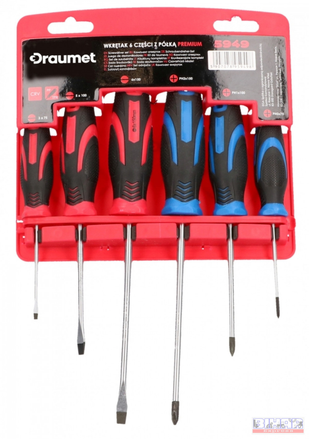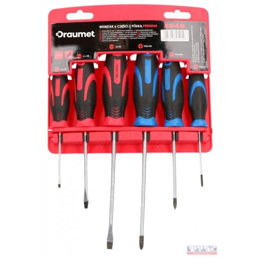 Gumírozott, műanyag nyelű CrV polírozott acélból 6 darabos Draumet csavarhúzó készlet.
