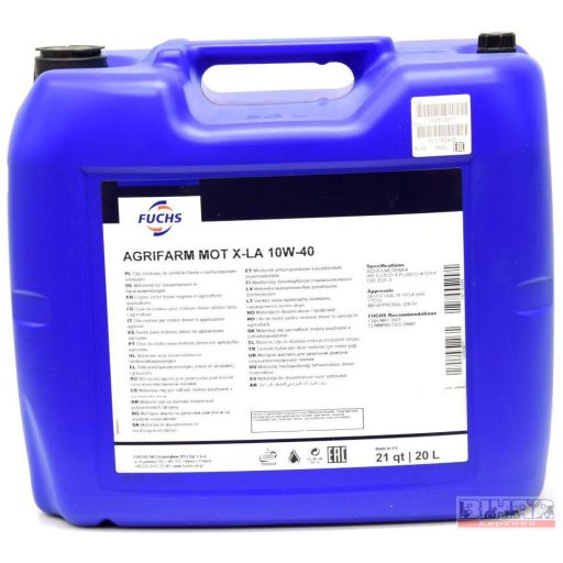 AGRIFARM MOT X-LA SAE 10W-40 speciálisan a mezőgazdasági gépjárművek részére fejlesztett termék, amelyek modern kipufogógáz után kezelő rendszerekkel vannak szerelve (EPA Tier 4 / EU Stage IV). Teljesíti az európai ACEAE9és az amerikai API CJ-4előírások kombinációját, amelyek szükségesek számos nagy gépgyártó berendezéseihez, mint például: John Deere, vagy CASE IH. A termék teljesíti a DEUTZ DQC IV-10 LA előírást, magába foglalva az egyedi engedélyeket is a legújabb TTCD motorokhoz, amelyet a FENDT traktorokba építenek és speciális igényeket támasztanak a motortisztasággal szemben. Keverhető és kompatibilis más gyártók megfelelő minőségű motorolajaival. Maximális teljesítményét csak akkor érjük el, ha AGRIFARM MOT X-LA SAE 10W-40 terméket nem keverjük más termékkel.