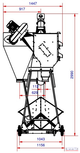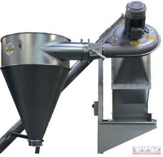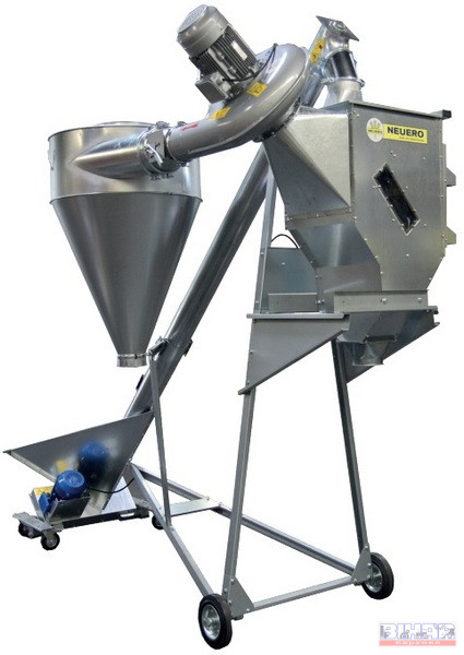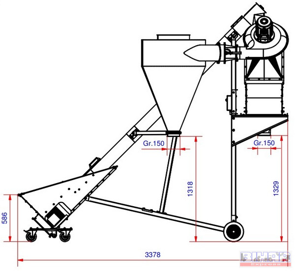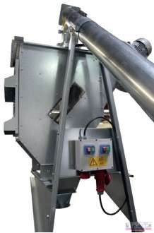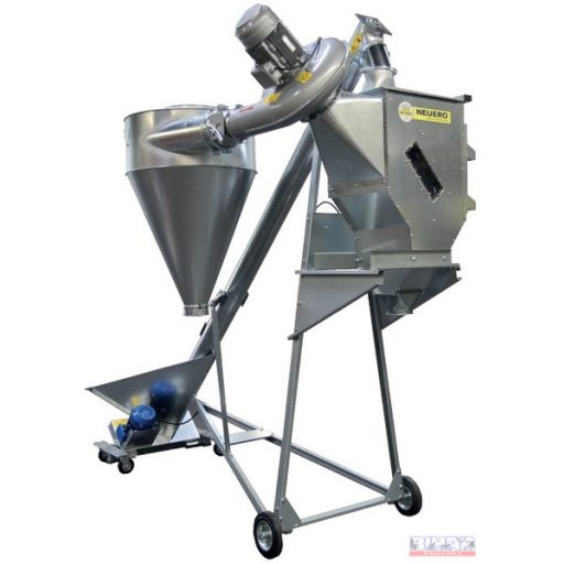 Ömlesztett áru kirakodására szolgáló mobil szállító csiga fogadó garattal és porleválasztó ciklonnal.