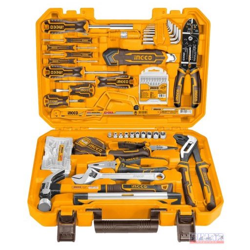 A készlet tartalmaz csavarkulcsokat, fogókat, csavarhúzókat, foglalatokat, racsnis fogantyút, kalapácsot, mérőszalagot, használati kést és még sok mást.