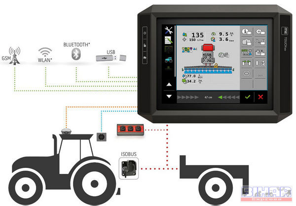 A gép vezérlése standardizált ISOBUS rendszerben történik, biztosítva a kompatibilitást és lehetővé téve az eszközök és a munkagépek gyártótól független vezérlését.
