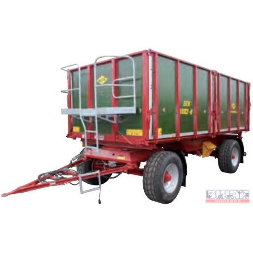 Két-tengelyes, három oldalra billentő pótkocsi fa felépítménnyel.