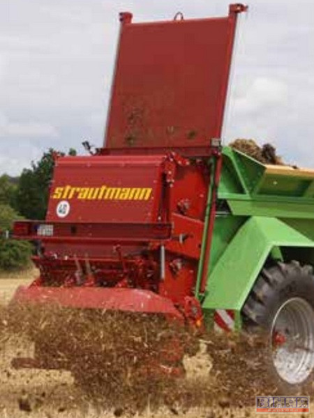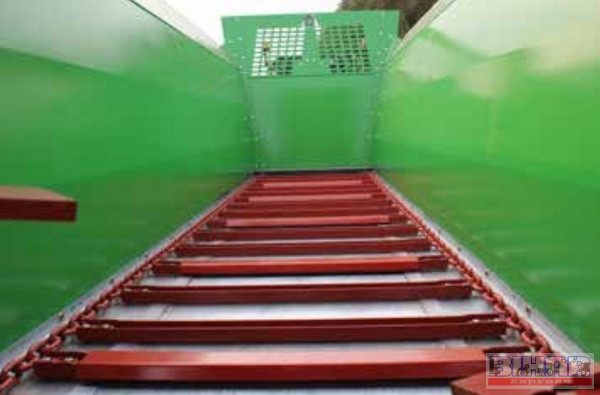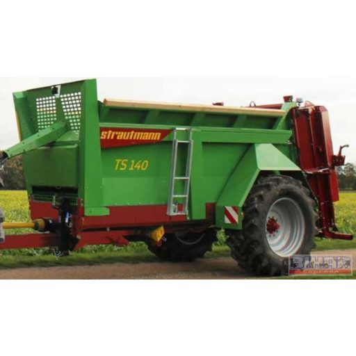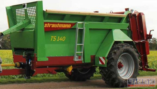 Alacsony platós szervestrágyaszóró pótkocsi.